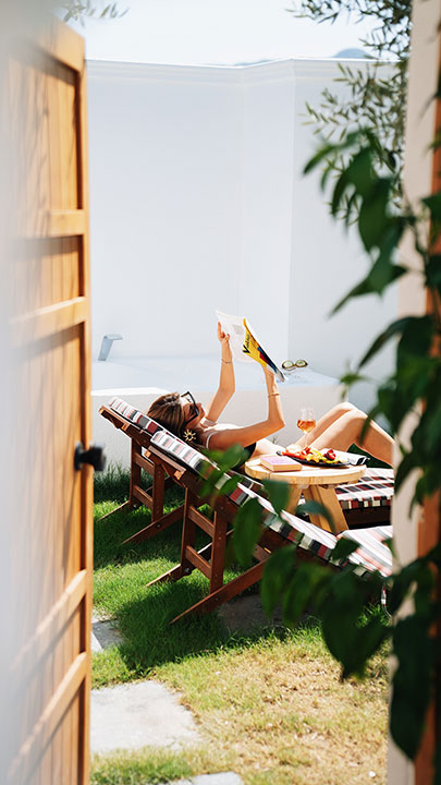 Ev, tesisin kalbinde yer almasına rağmen oldukça korunaklıdır; dışarıya kapalı planı ve dağlara bakan manzarasıyla mahremiyet sağlar. Bahçenizdeki asırlık zeytin ağacı, rüzgarla havuzunuza düşen yapraklarıyla size zamanın dinginliğini fısıldar.